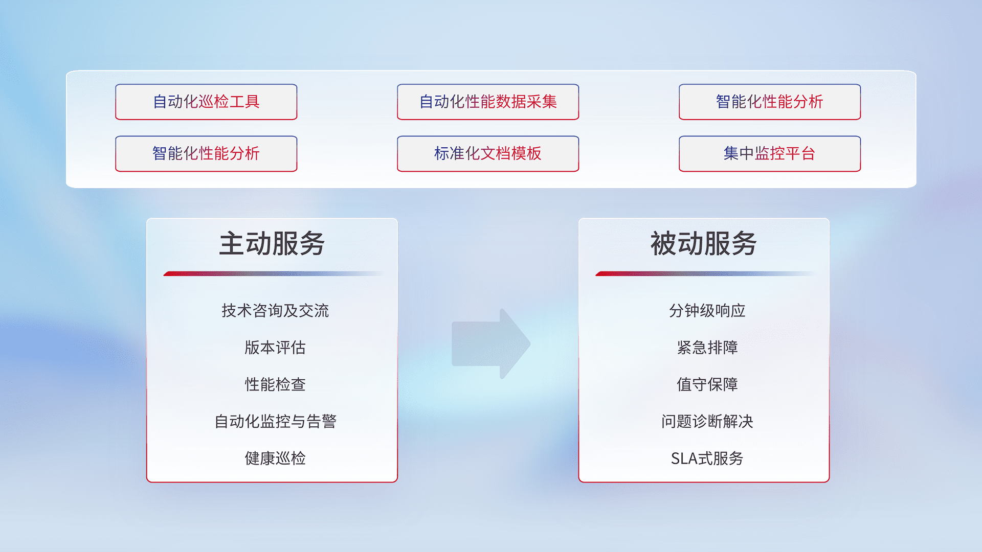 智能化工具和标准化文档,,,保障服务质量,,提供主动服务(包含技术咨询、、、、版本评估、、、、性能检查、、自动化监控与告警、、、健康巡检)和被动服务包含(分钟级响应、、紧急排障、、、值守保障、、、问题诊断解决、、、SLA服务)。。。。