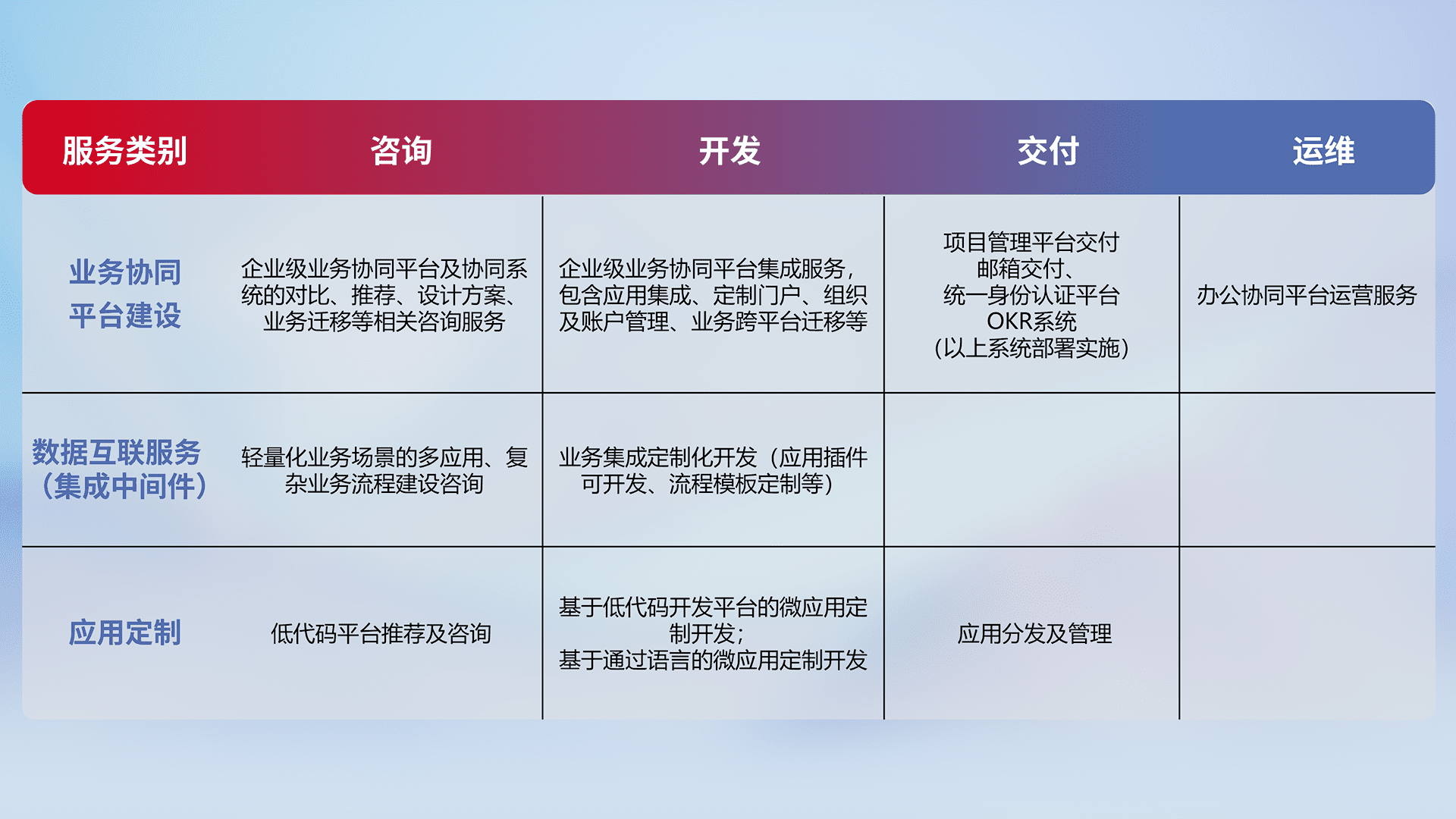 针对钉钉、、、、企微、、、、IDaas等平台级产品提供产品的规划、、、方案、、、、交付、、、、定制化开发等服务,,,,实现如统一协同办公、、、智能客户服务、、、混合会议管理、、、智能数据查询、、等业务场景,,,,实现数字化转型。。。。
